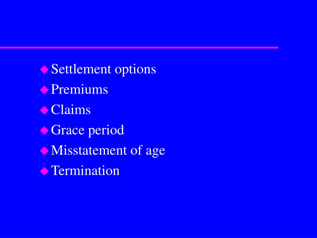 Settlement options • Premiums • Claims • Grace period • Misstatement of age • Termination