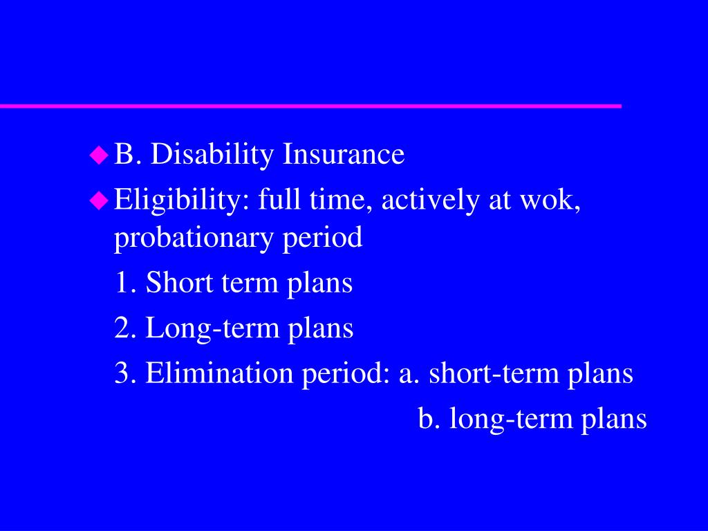 B. Disability Insurance • Eligibility: full time, actively at wok, probationary period 1. Short term plans 2. Long-term plans 3. Elimination period: a. short-term plans b. long-term plans