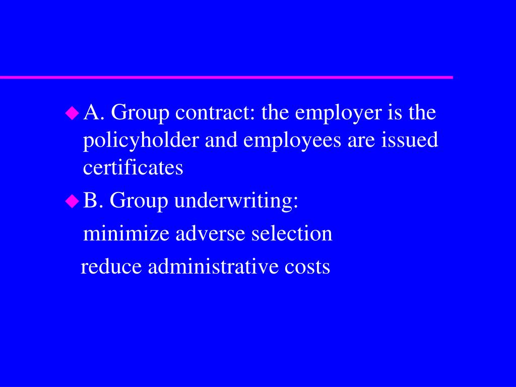 A. Group contract: the employer is the policyholder and employees are issued certificates • B. Group underwriting: minimize adverse selection reduce administrative costs