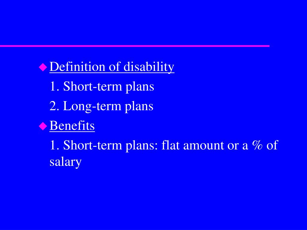 Definition of disability 1. Short-term plans 2. Long-term plans • Benefits 1. Short-term plans: flat amount or a % of salary