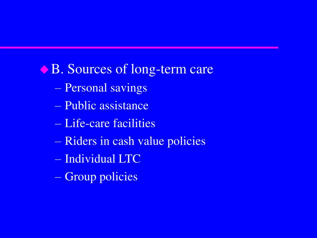 B. Sources of long-term care • Personal savings • Public assistance • Life-care facilities • Riders in cash value policies • Individual LTC • Group policies