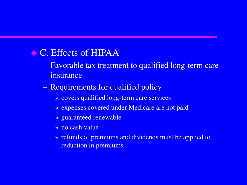 C. Effects of HIPAA • Favorable tax treatment to qualified long-term care insurance • Requirements for qualified policy • covers qualified long-term care services • expenses covered under Medicare are not paid • guaranteed renewable • no cash value • refunds of premiums and dividends must be applied to reduction in premiums