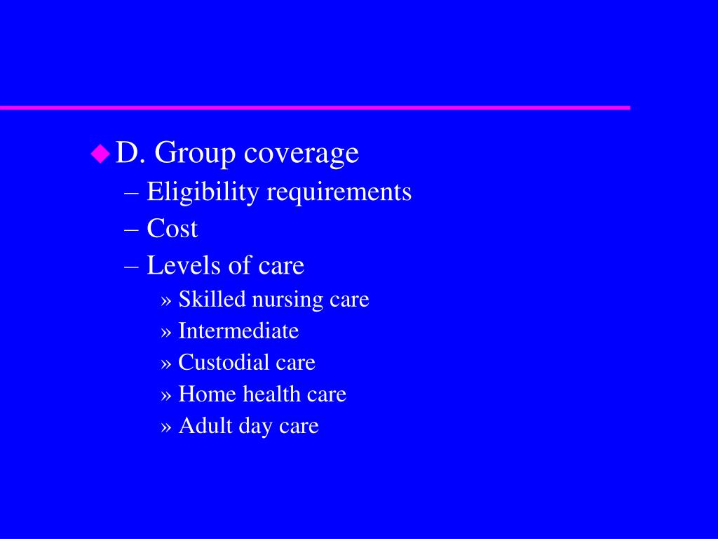 D. Group coverage • Eligibility requirements • Cost • Levels of care • Skilled nursing care • Intermediate • Custodial care • Home health care • Adult day care