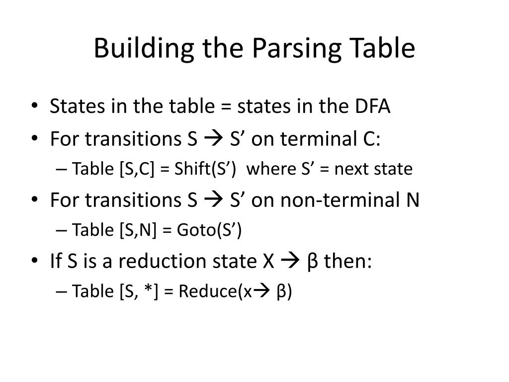 Building the Parsing Table • States in the table = states in the DFA • For transitions S S’ on terminal C: • Table [S,C] = Shift(S’) where S’ = next state • For transitions S S’ on non-terminal N • Table [S,N] = Goto(S’) • If S is a reduction state X β then: • Table [S, *] = Reduce(x β)