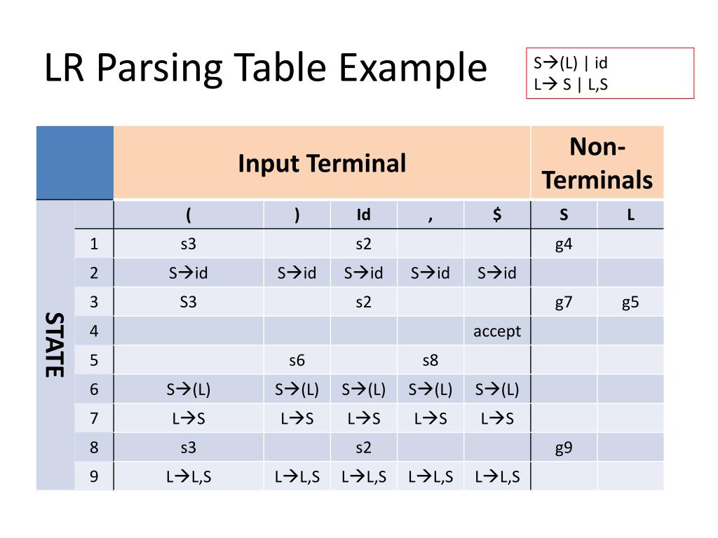 Goto: Non-terminal Symbols Grammar S(L) | id L S | L,S Same algorithm for transitions on non-terminals S ( L . ) L L . , S L S ( . L ) L . S L . L , S S . ( L ) S . id S’ . S $ S . ( L ) S . id ( S L S . id ( id S id .