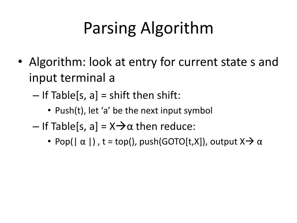 Parsing Algorithm • Algorithm: look at entry for current state s and input terminal a • If Table[s, a] = shift then shift: • Push(t), let ‘a’ be the next input symbol • If Table[s, a] = Xα then reduce: • Pop(| α |) , t = top(), push(GOTO[t,X]), output X α