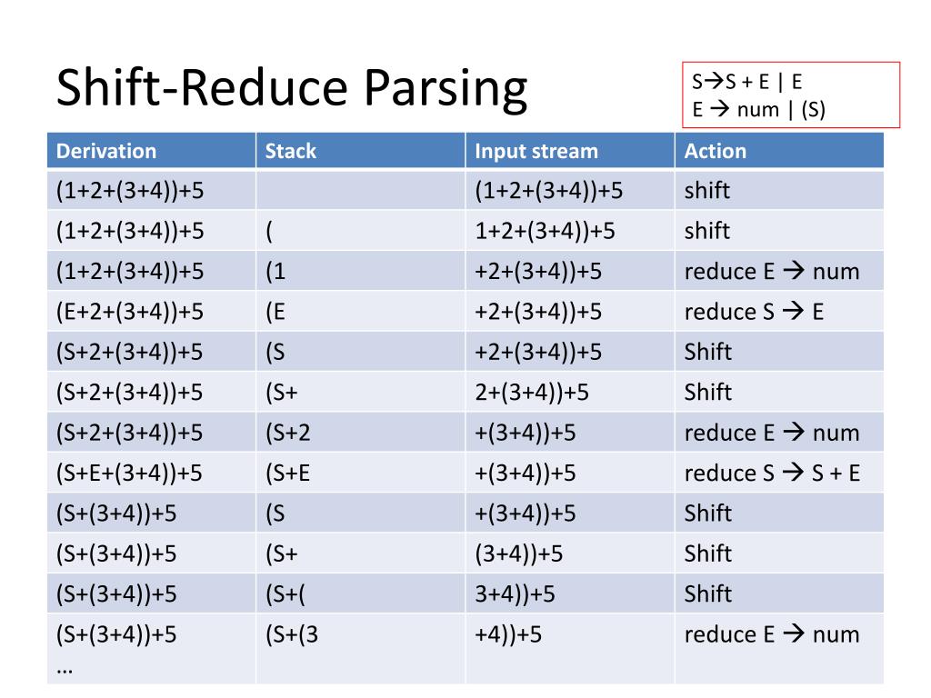 Shift-Reduce Parsing SS + E | E E num | (S)