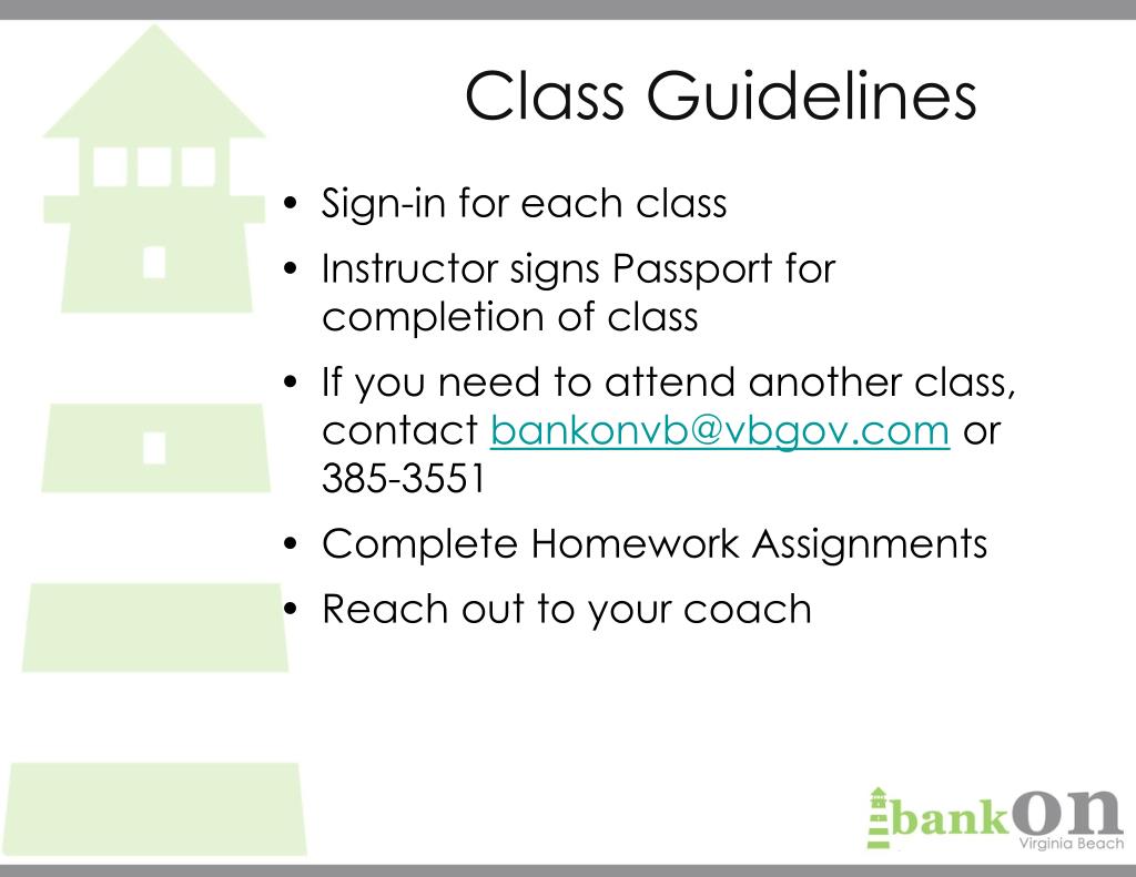 Sign-in for each class Instructor signs Passport for completion of class If you need to attend another class, contact bankonvb@vbgov.com or 385-3551 Complete Homework Assignments Reach out to your coach Class Guidelines
