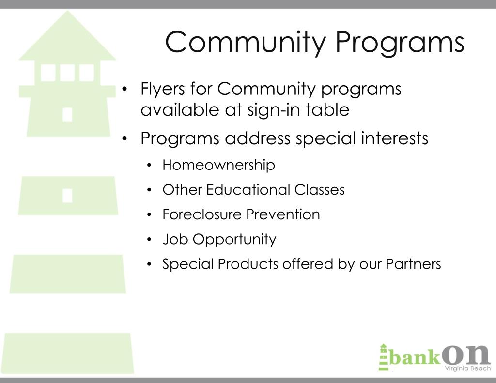 Flyers for Community programs available at sign-in table Programs address special interests Homeownership Other Educational Classes Foreclosure Prevention Job Opportunity Special Products offered by our Partners Community Programs