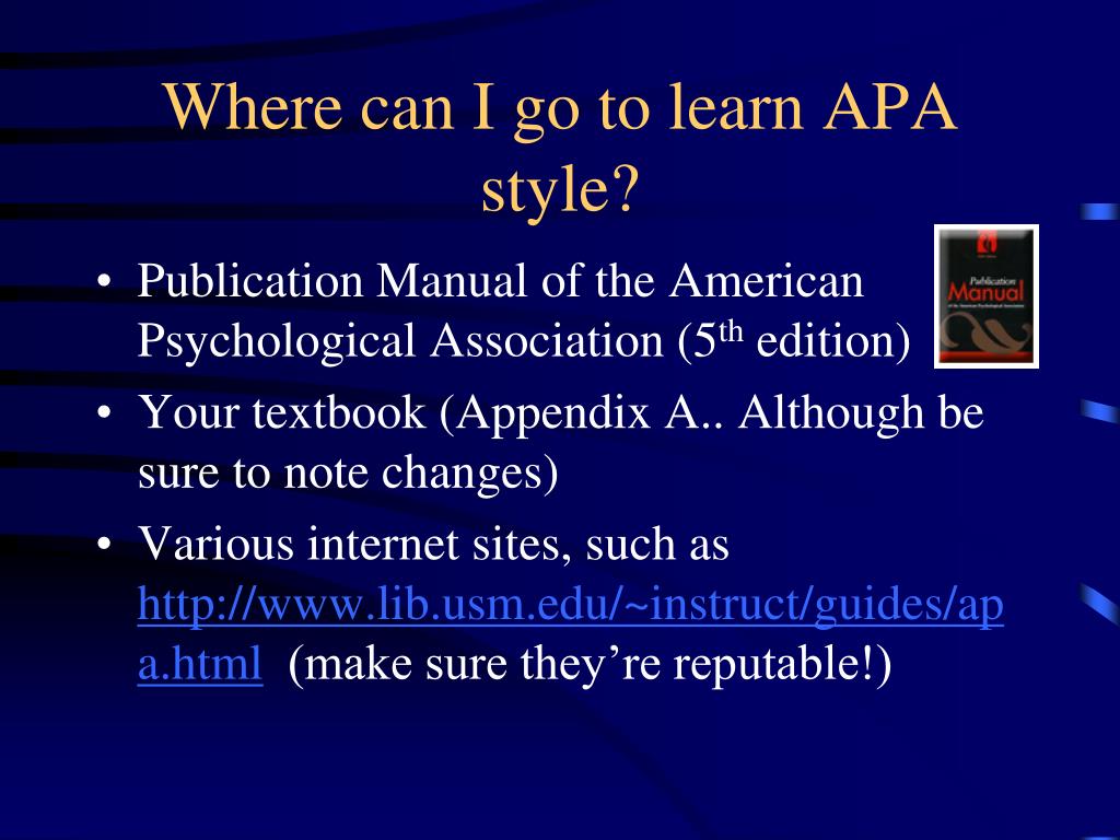 Where can I go to learn APA style? • Publication Manual of the American Psychological Association (5th edition) • Your textbook (Appendix A.. Although be sure to note changes) • Various internet sites, such as http://www.lib.usm.edu/~instruct/guides/apa.html (make sure they’re reputable!)