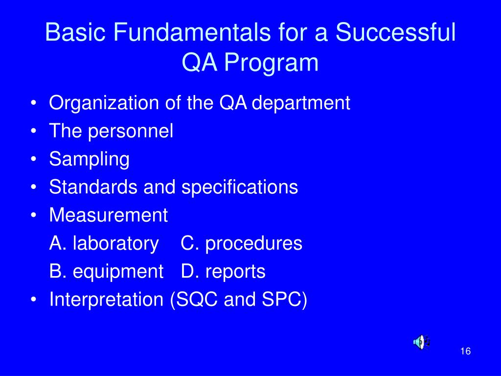Basic Fundamentals for a Successful QA Program • Organization of the QA department • The personnel • Sampling • Standards and specifications • Measurement A. laboratory C. procedures B. equipment D. reports • Interpretation (SQC and SPC)