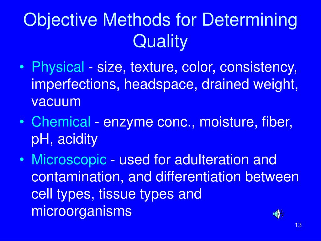 Objective Methods for Determining Quality • Physical - size, texture, color, consistency, imperfections, headspace, drained weight, vacuum • Chemical - enzyme conc., moisture, fiber, pH, acidity • Microscopic - used for adulteration and contamination, and differentiation between cell types, tissue types and microorganisms