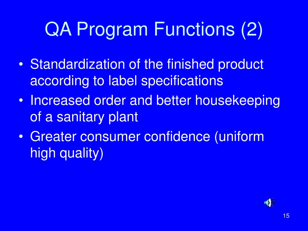 QA Program Functions (2) • Standardization of the finished product according to label specifications • Increased order and better housekeeping of a sanitary plant • Greater consumer confidence (uniform high quality)