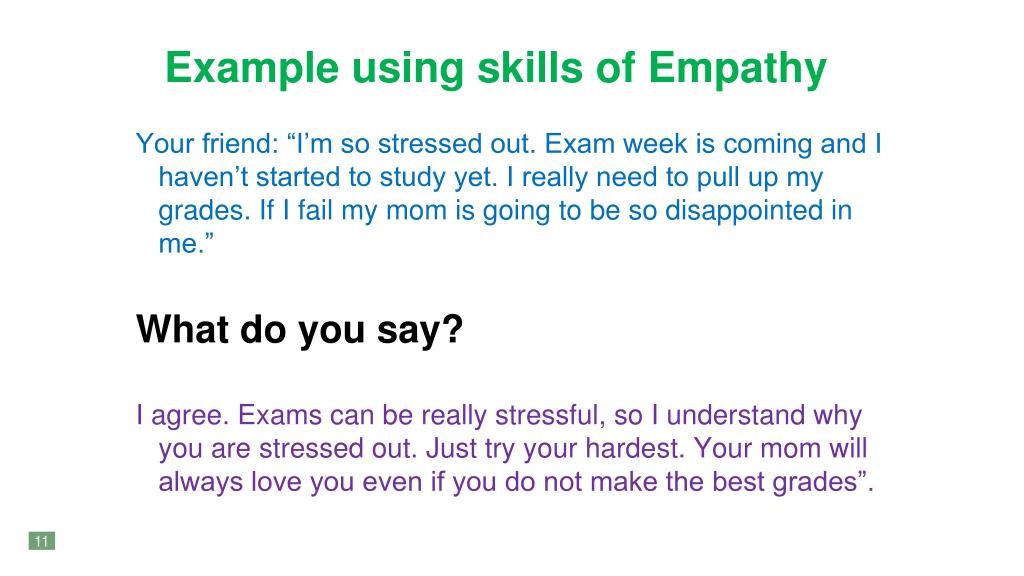 Example using skills of Empathy Your friend: “I’m so stressed out. Exam week is coming and I haven’t started to study yet. I really need to pull up my grades. If I fail my mom is going to be so disappointed in me.” What do you say? I agree. Exams can be really stressful, so I understand why you are stressed out. Just try your hardest. Your mom will always love you even if you do not make the best grades”.