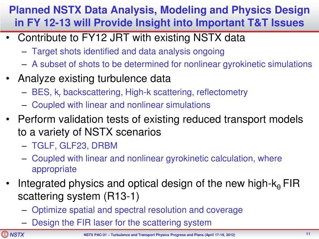 Planned NSTX Data Analysis, Modeling and Physics Design in FY 12-13 will Provide Insight into Important T&T Issues • Contribute to FY12 JRT with existing NSTX data • Target shots identified and data analysis ongoing • A subset of shots to be determined for nonlinear gyrokinetic simulations • Analyze existing turbulence data • BES, kr backscattering, High-k scattering, reflectometry • Coupled with linear and nonlinear simulations • Perform validation tests of existing reduced transport models to a variety of NSTX scenarios • TGLF, GLF23, DRBM • Coupled with linear and nonlinear gyrokinetic calculation, where appropriate • Integrated physics and optical design of the new high-kθFIR scattering system (R13-1) • Optimize spatial and spectral resolution and coverage • Design the FIR laser for the scattering system