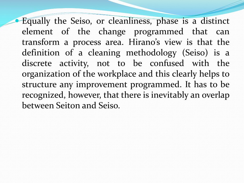 Equally the Seiso, or cleanliness, phase is a distinct element of the change programmed that can transform a process area. Hirano’s view is that the definition of a cleaning methodology (Seiso) is a discrete activity, not to be confused with the organization of the workplace and this clearly helps to structure any improvement programmed. It has to be recognized, however, that there is inevitably an overlap between Seiton and Seiso.