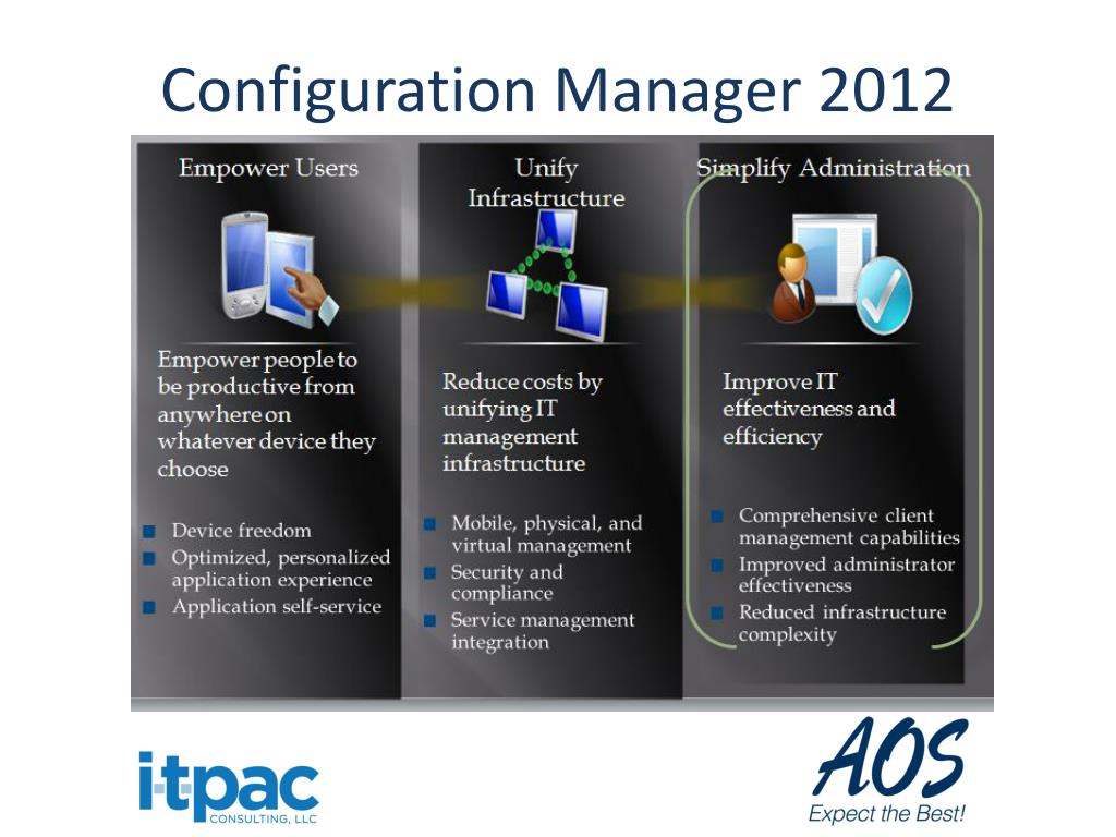 System Center Suite consists of 5 Pieces • Configuration Manager (SCCM) • Operations Manager (SCOM) • Data protection Manager (SCDPM) • Virtual Machine Manager (SCVMM) • Service Manager (SCSM) • System Center Orchestrator • All of the formerly independent pieces now bundled together with SCCM 2012. If you have it, you have it all