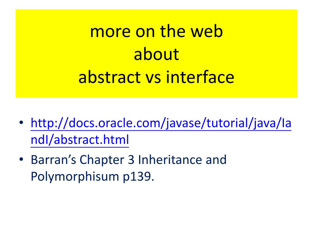 more on the webaboutabstract vs interface • http://docs.oracle.com/javase/tutorial/java/IandI/abstract.html • Barran’s Chapter 3 Inheritance and Polymorphisum p139.