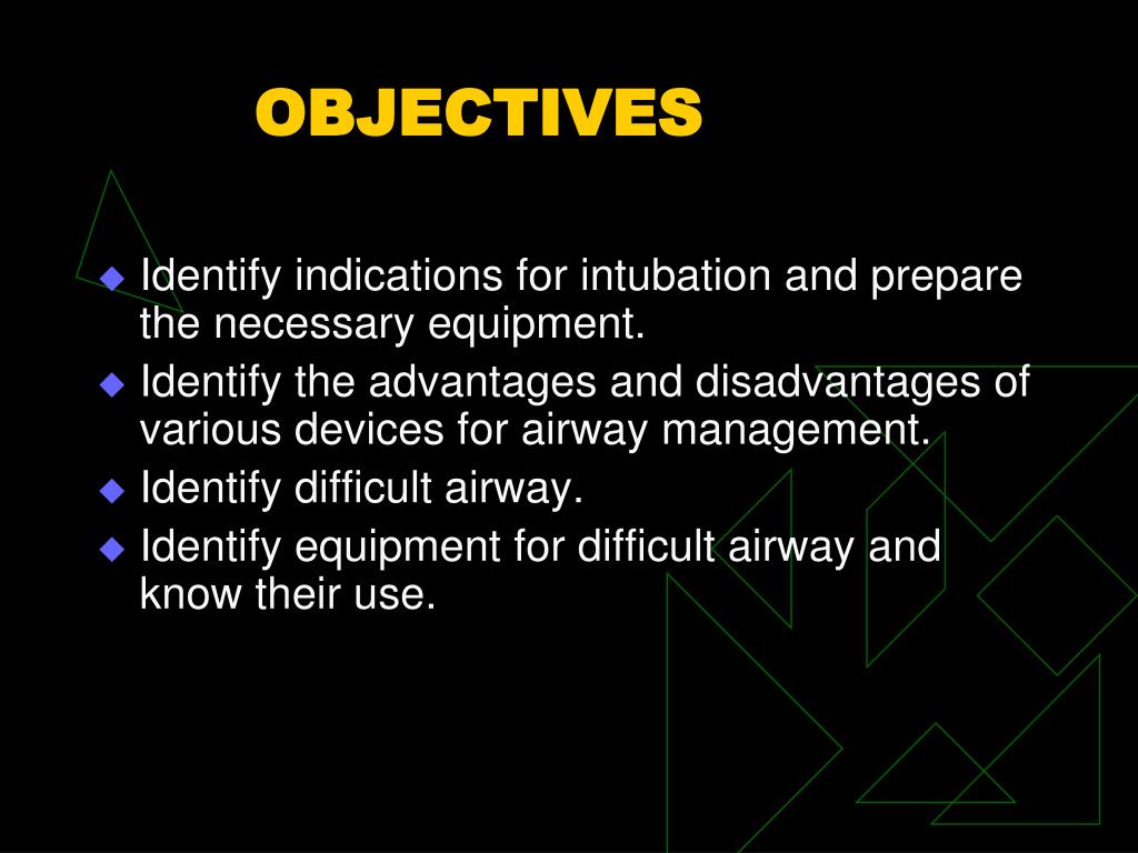 AIRWAY MANAGEMENT. OBJECTIVES. Identify indications for intubation and prepare the necessary equipment. Identify the advantages and disadvantages of various devices for airway management. Identify difficult airway. Identify equipment for difficult airway and know their use.