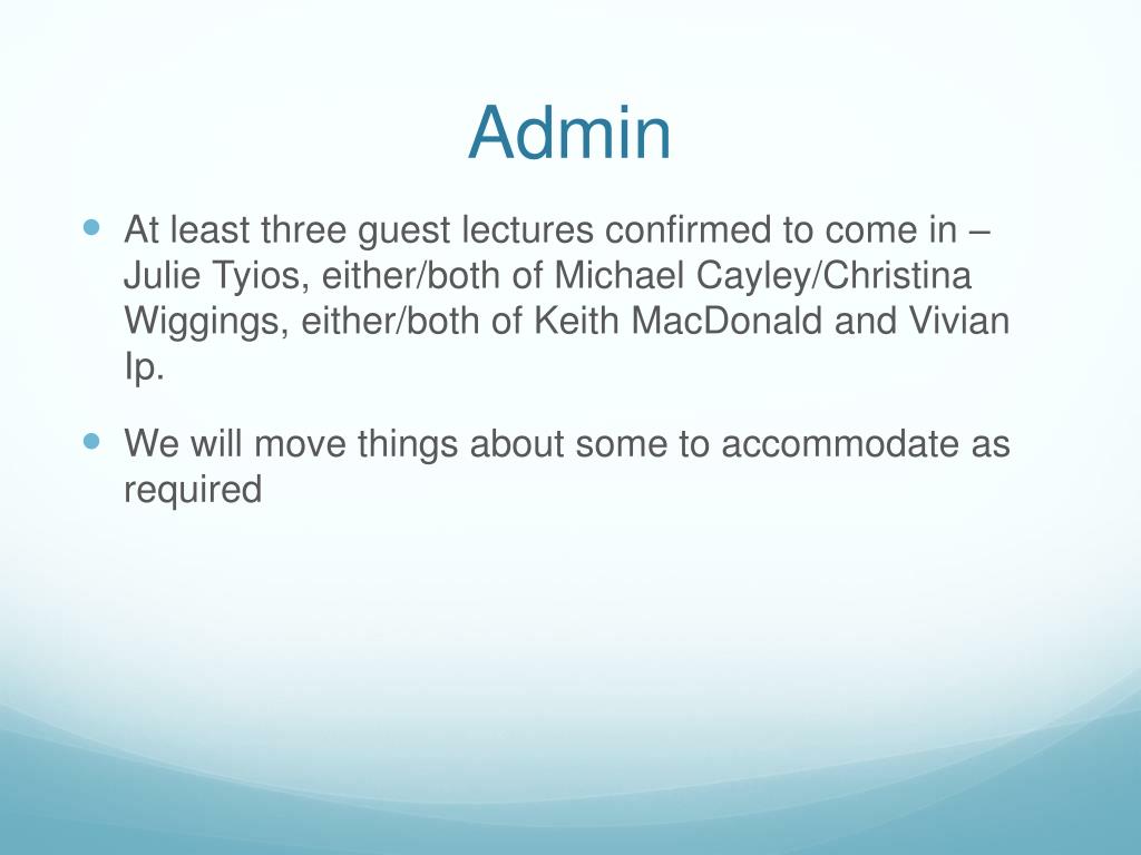 Admin • At least three guest lectures confirmed to come in – Julie Tyios, either/both of Michael Cayley/Christina Wiggings, either/both of Keith MacDonald and Vivian Ip. • We will move things about some to accommodate as required