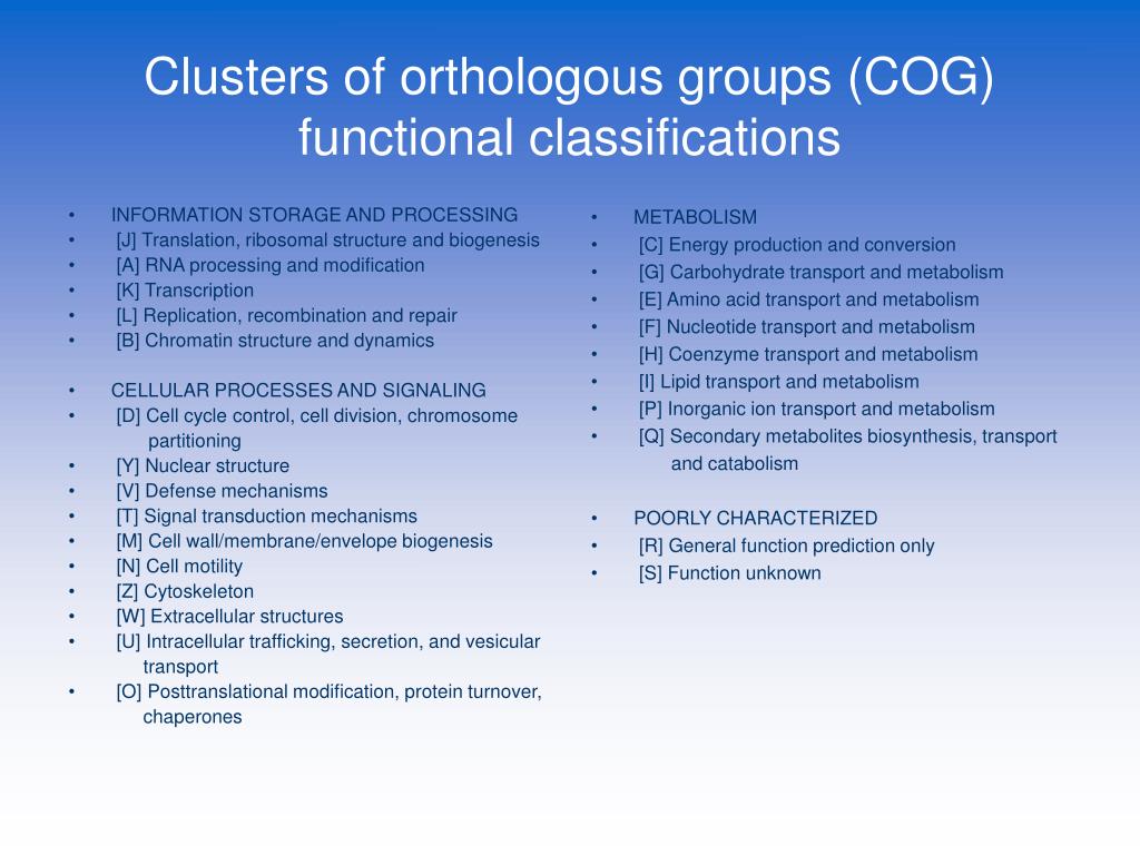 INFORMATION STORAGE AND PROCESSING [J] Translation, ribosomal structure and biogenesis [A] RNA processing and modification [K] Transcription [L] Replication, recombination and repair [B] Chromatin structure and dynamics CELLULAR PROCESSES AND SIGNALING [D] Cell cycle control, cell division, chromosome partitioning [Y] Nuclear structure [V] Defense mechanisms [T] Signal transduction mechanisms [M] Cell wall/membrane/envelope biogenesis [N] Cell motility [Z] Cytoskeleton [W] Extracellular structures [U] Intracellular trafficking, secretion, and vesicular transport [O] Posttranslational modification, protein turnover, chaperones METABOLISM [C] Energy production and conversion [G] Carbohydrate transport and metabolism [E] Amino acid transport and metabolism [F] Nucleotide transport and metabolism [H] Coenzyme transport and metabolism [I] Lipid transport and metabolism [P] Inorganic ion transport and metabolism [Q] Secondary metabolites biosynthesis, transport and catabolism POORLY CHARACTERIZED [R] General function prediction only [S] Function unknown Clusters of orthologous groups (COG) functional classifications