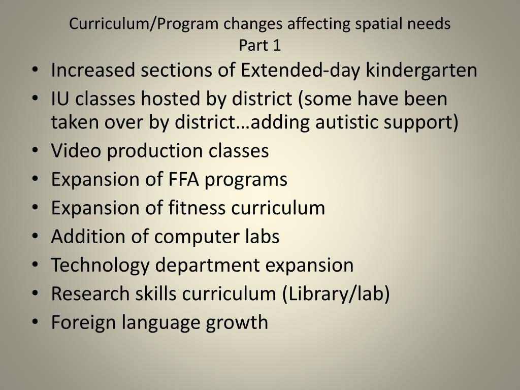 Curriculum/Program changes affecting spatial needsPart 1 • Increased sections of Extended-day kindergarten • IU classes hosted by district (some have been taken over by district…adding autistic support) • Video production classes • Expansion of FFA programs • Expansion of fitness curriculum • Addition of computer labs • Technology department expansion • Research skills curriculum (Library/lab) • Foreign language growth