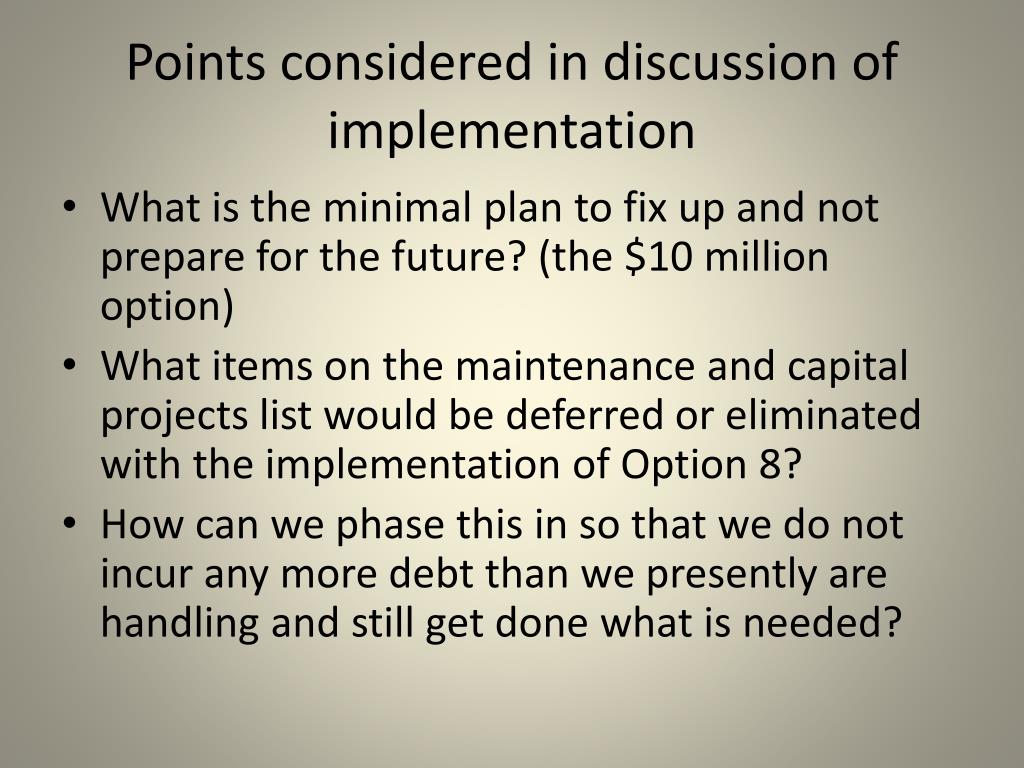 Points considered in discussion of implementation • What is the minimal plan to fix up and not prepare for the future? (the $10 million option) • What items on the maintenance and capital projects list would be deferred or eliminated with the implementation of Option 8? • How can we phase this in so that we do not incur any more debt than we presently are handling and still get done what is needed?