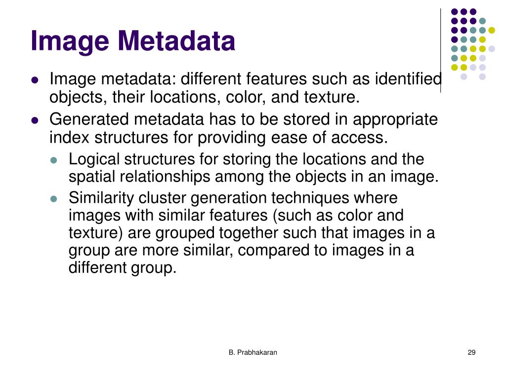 Image Metadata • Image metadata: different features such as identified objects, their locations, color, and texture. • Generated metadata has to be stored in appropriate index structures for providing ease of access. • Logical structures for storing the locations and the spatial relationships among the objects in an image. • Similarity cluster generation techniques where images with similar features (such as color and texture) are grouped together such that images in a group are more similar, compared to images in a different group. B. Prabhakaran