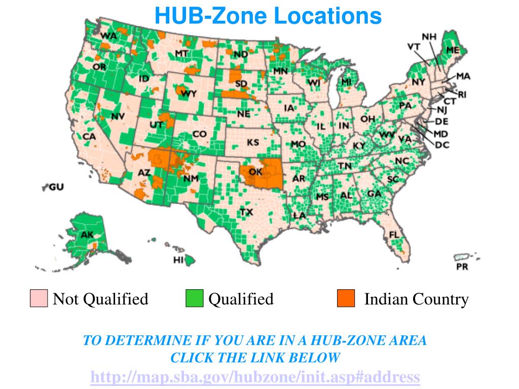 HUB-Zone Locations Not Qualified Qualified Indian Country TO DETERMINE IF YOU ARE IN A HUB-ZONE AREA CLICK THE LINK BELOW http://map.sba.gov/hubzone/init.asp#address