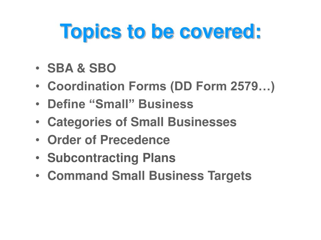 Topics to be covered:. Small Business Administration and Small Business Office Coordination Forms (DD Form 2579…) Define “Small” Categories of Small Businesses Order of Precedence Subcontracting Plans Command Small Business Targets.