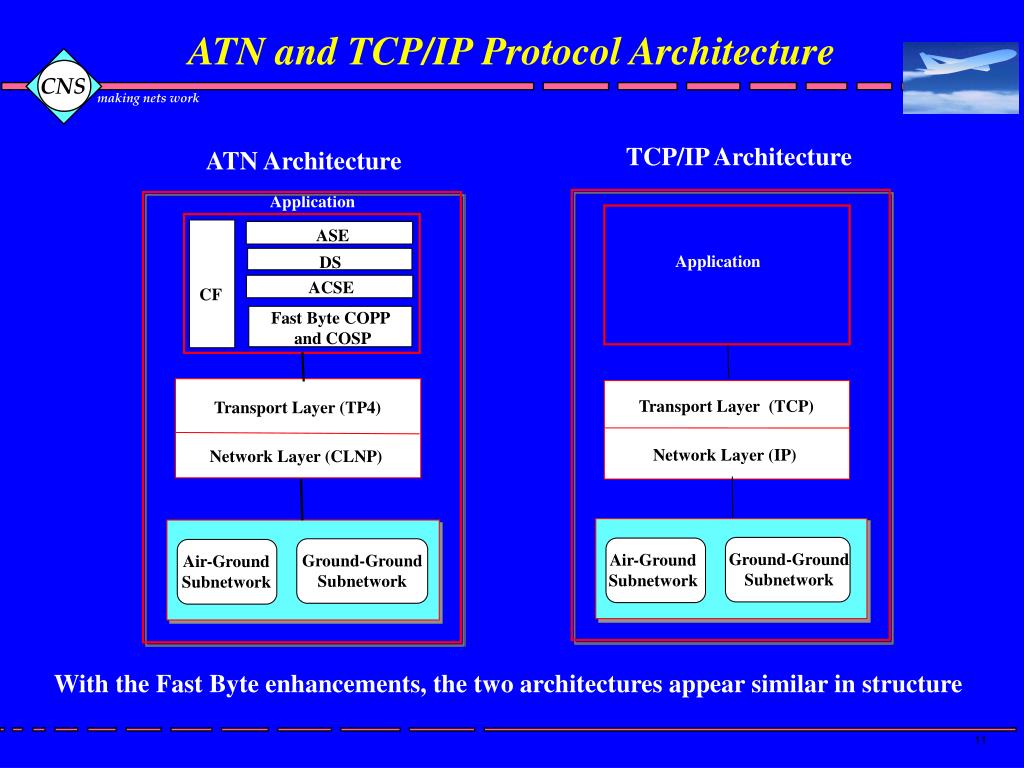 ATN and TCP/IP Protocol Architecture TCP/IP Architecture ATN Architecture Application ASE Application DS ACSE CF Fast Byte COPP and COSP Transport Layer (TCP) Transport Layer (TP4) Network Layer (IP) Network Layer (CLNP) Ground-Ground Subnetwork Air-Ground Subnetwork Ground-Ground Subnetwork Air-Ground Subnetwork With the Fast Byte enhancements, the two architectures appear similar in structure
