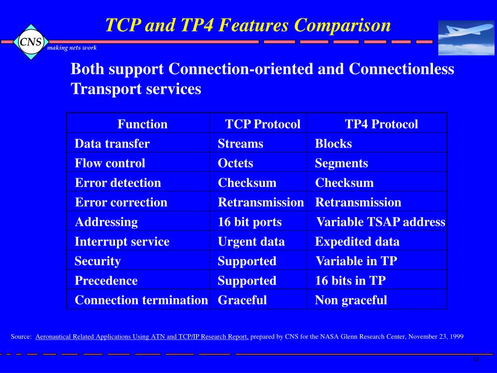 TCP and TP4 Features Comparison Function TCP Protocol TP4 Protocol Data transfer Streams Blocks Flow control Octets Segments Error detection Checksum Checksum Error correction Retransmission Retransmission Addressing 16 bit ports Variable TSAP address Interrupt service Urgent data Expedited data Security Supported Variable in TP Precedence Supported 16 bits in TP Connection termination Graceful Non graceful Both support Connection-oriented and Connectionless Transport services Source: Aeronautical Related Applications Using ATN and TCP/IP Research Report, prepared by CNS for the NASA Glenn Research Center, November 23, 1999
