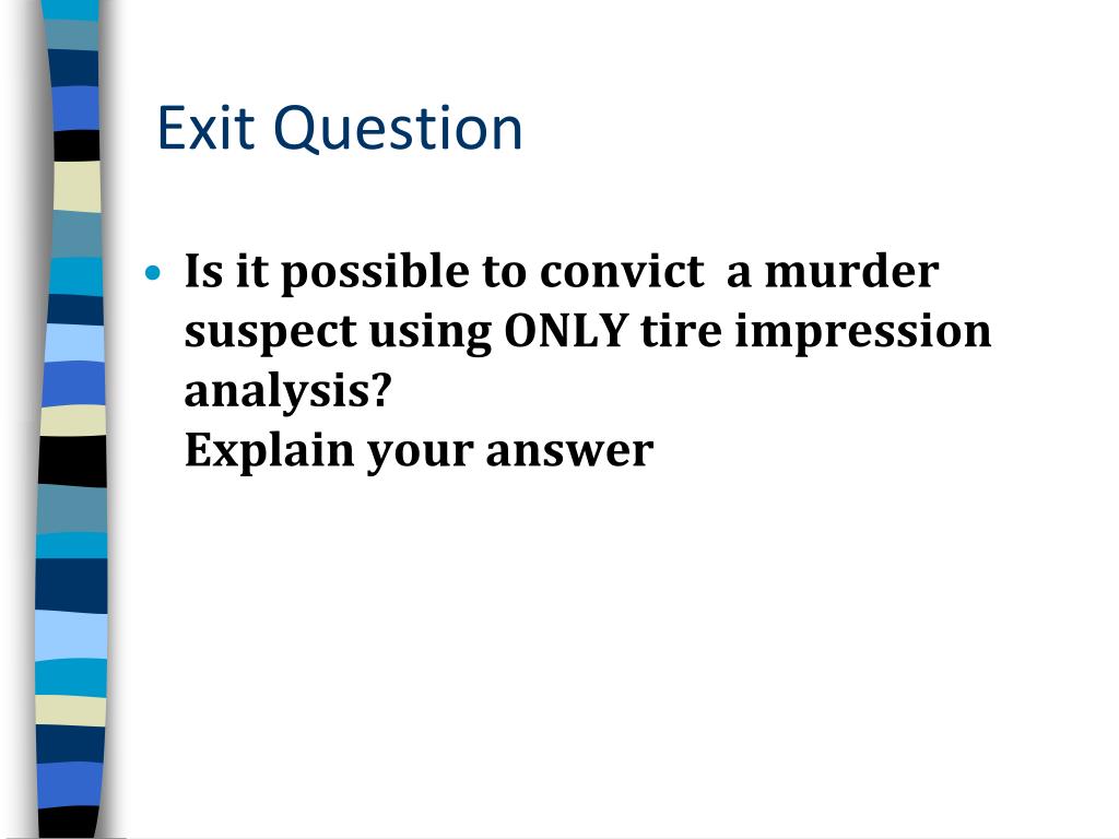 Exit Question • Is it possible to convict a murder suspect using ONLY tire impression analysis? Explain your answer