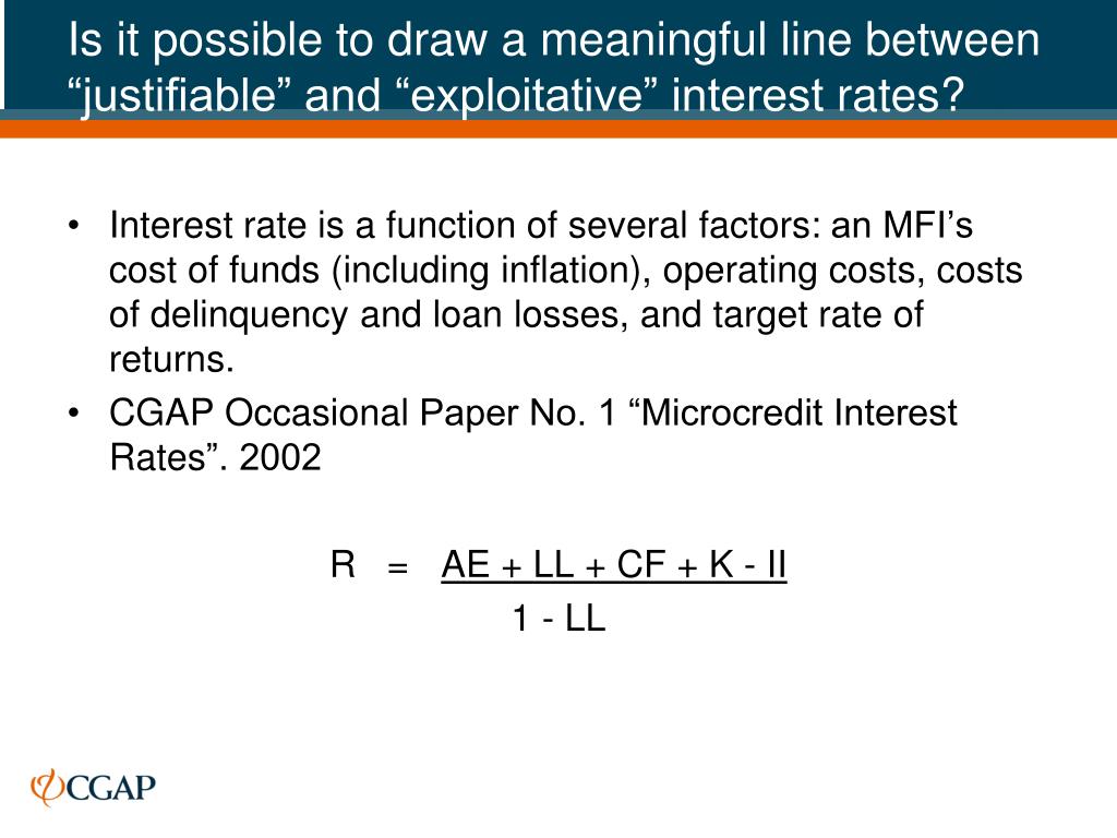 Is it possible to draw a meaningful line between “justifiable” and “exploitative” interest rates? • Interest rate is a function of several factors: an MFI’s cost of funds (including inflation), operating costs, costs of delinquency and loan losses, and target rate of returns. • CGAP Occasional Paper No. 1 “Microcredit Interest Rates”. 2002 R = AE + LL + CF + K - II 1 - LL