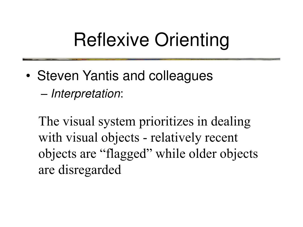 Reflexive Orienting • Steven Yantis and colleagues • Interpretation: The visual system prioritizes in dealing with visual objects - relatively recent objects are “flagged” while older objects are disregarded