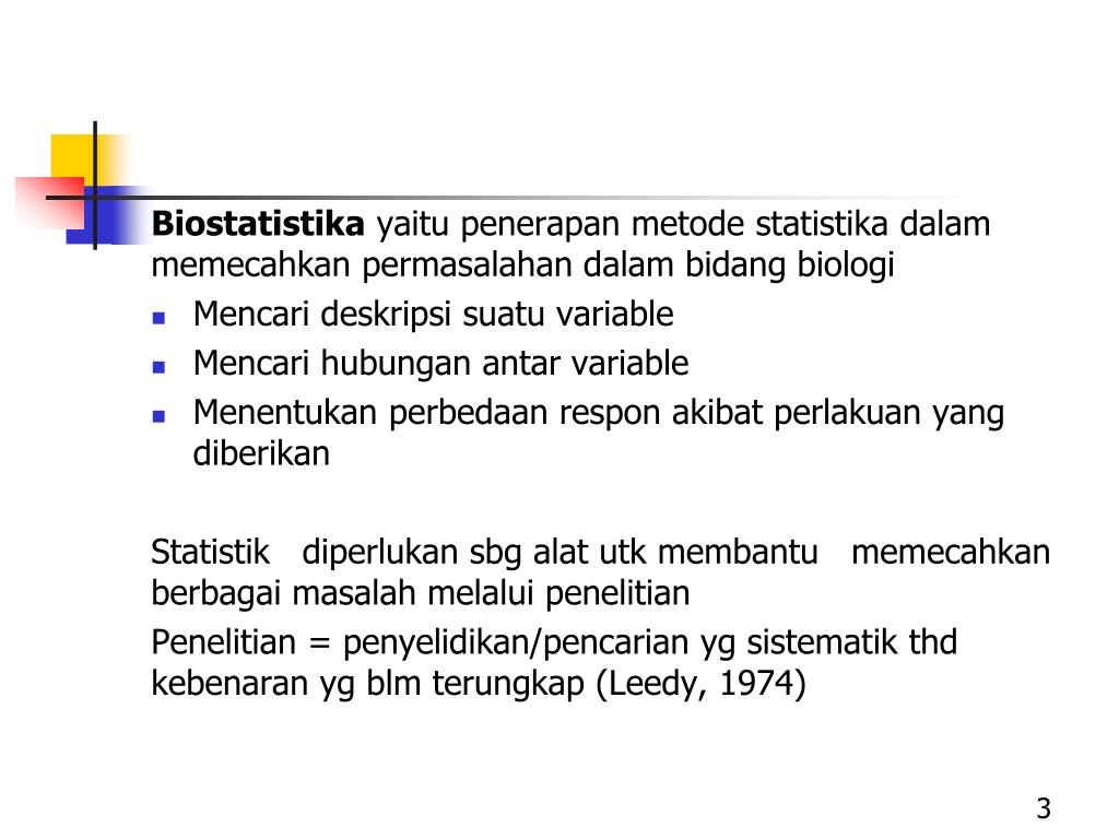 BiostatistikayaitupenerapanmetodestatistikadalammemecahkanpermasalahandalambidangbiologiBiostatistikayaitupenerapanmetodestatistikadalammemecahkanpermasalahandalambidangbiologi • Mencarideskripsisuatu variable • Mencarihubunganantar variable • Menentukanperbedaanresponakibatperlakuan yang diberikan Statistikdiperlukansbgalatutkmembantumemecahkanberbagaimasalahmelaluipenelitian Penelitian = penyelidikan/pencarianygsistematikthdkebenaranygblmterungkap (Leedy, 1974)