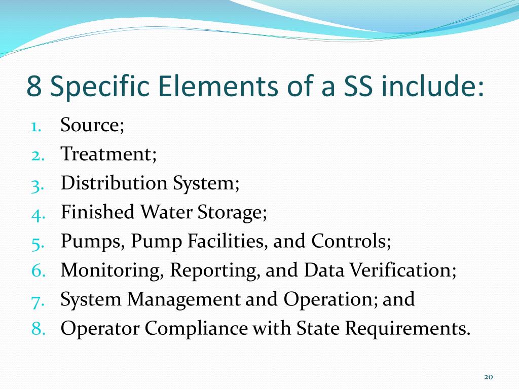 8 Specific Elements of a SS include: • Source; • Treatment; • Distribution System; • Finished Water Storage; • Pumps, Pump Facilities, and Controls; • Monitoring, Reporting, and Data Verification; • System Management and Operation; and • Operator Compliance with State Requirements.