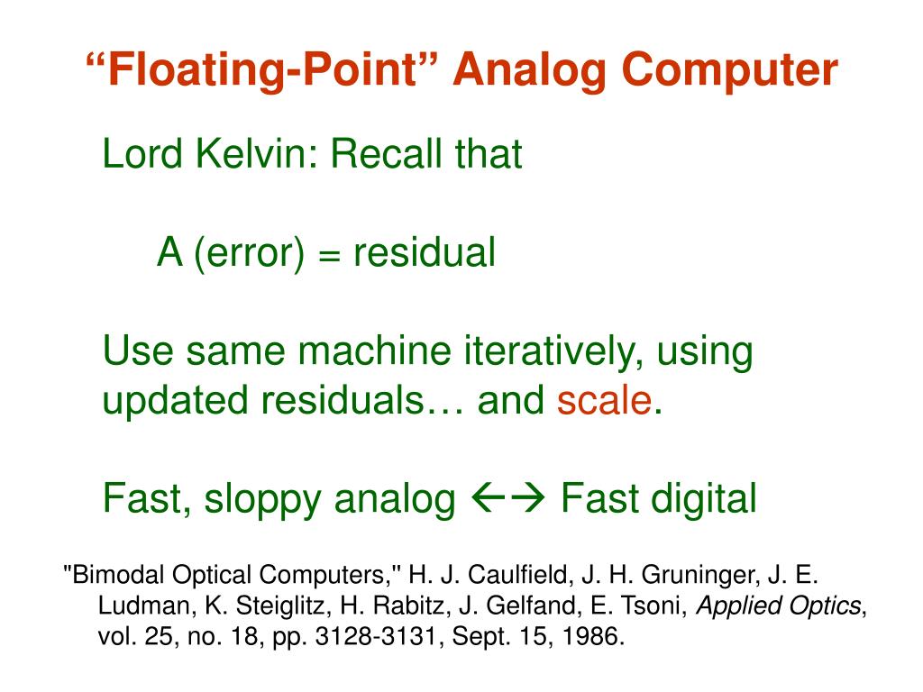 “Floating-Point” Analog Computer Lord Kelvin: Recall that A (error) = residual Use same machine iteratively, using updated residuals… and scale. Fast, sloppy analog Fast digital "Bimodal Optical Computers,'' H. J. Caulfield, J. H. Gruninger, J. E. Ludman, K. Steiglitz, H. Rabitz, J. Gelfand, E. Tsoni, Applied Optics, vol. 25, no. 18, pp. 3128-3131, Sept. 15, 1986.