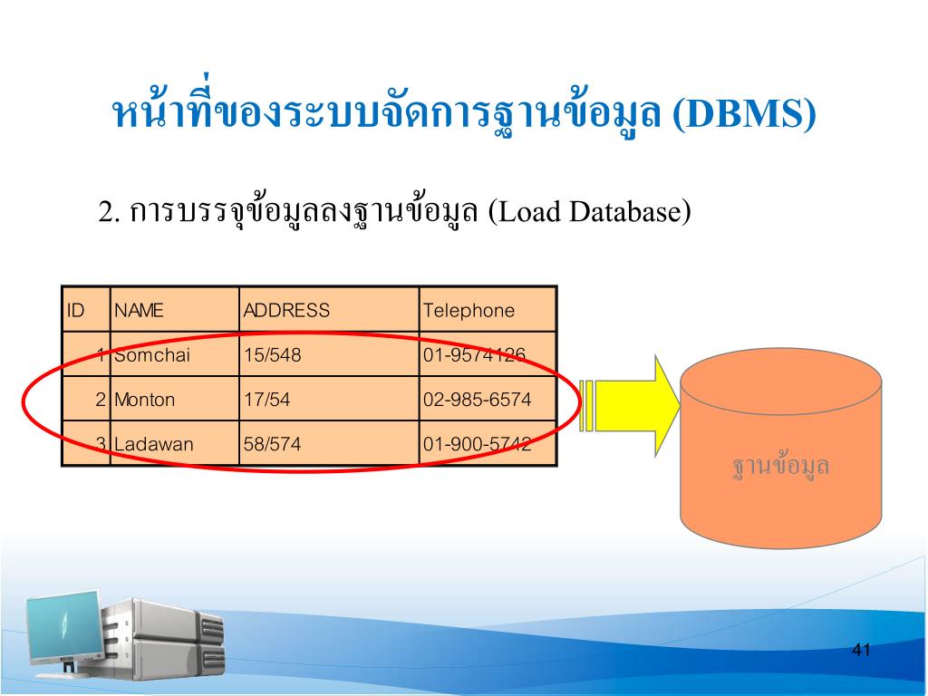 หน้าที่ของระบบจัดการฐานข้อมูล (DBMS) 2. การบรรจุข้อมูลลงฐานข้อมูล (Load Database) ฐานข้อมูล