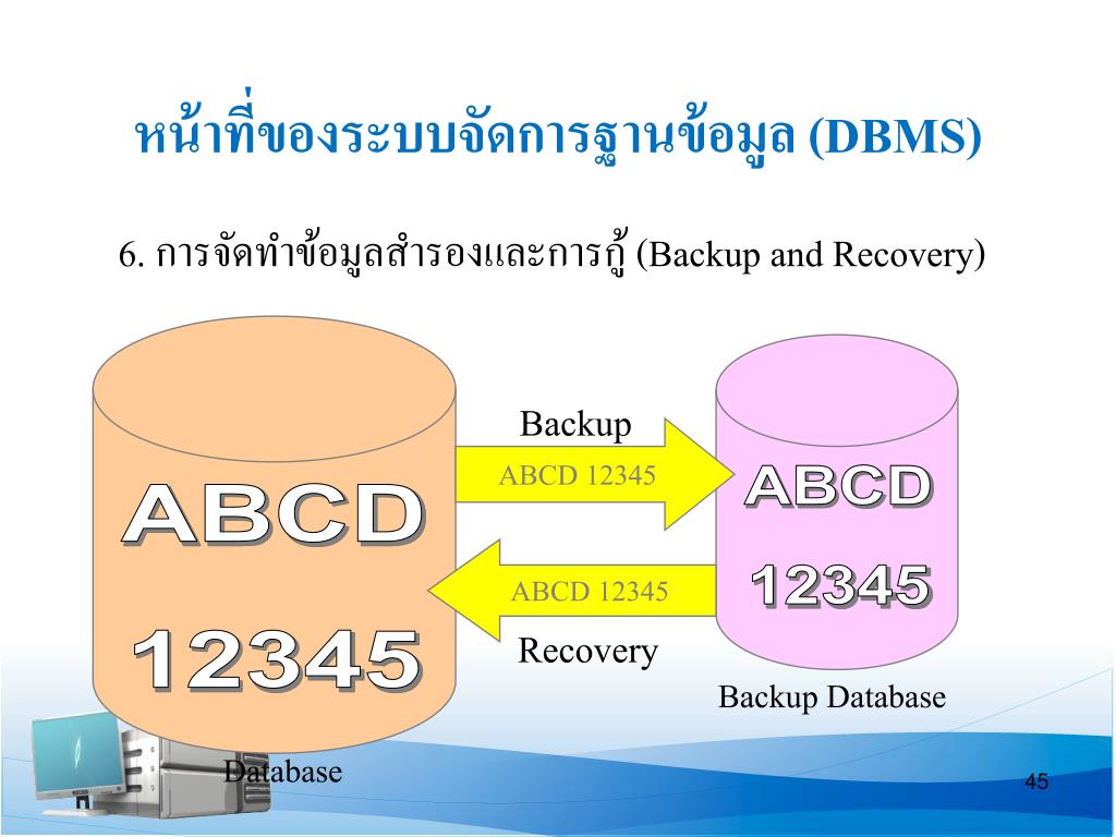 หน้าที่ของระบบจัดการฐานข้อมูล (DBMS) 6. การจัดทำข้อมูลสำรองและการกู้ (Backup and Recovery) Backup ABCD 12345 ABCD 12345 ABCD 12345 ABCD 12345 Recovery Backup Database Database