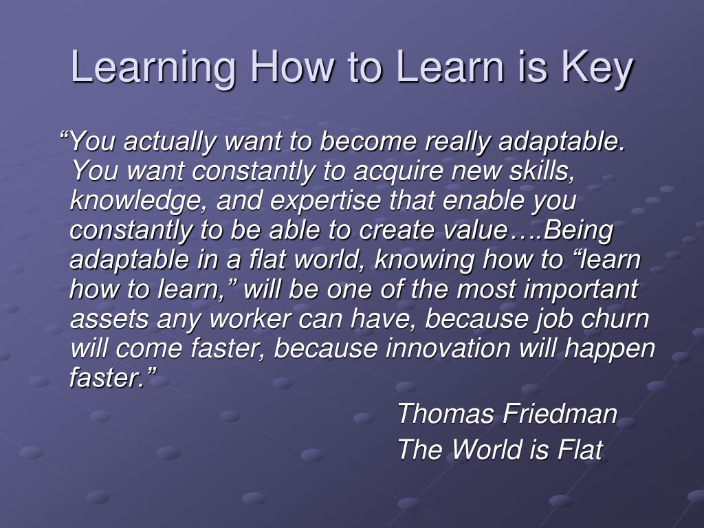 Learning How to Learn is Key “You actually want to become really adaptable. You want constantly to acquire new skills, knowledge, and expertise that enable you constantly to be able to create value….Being adaptable in a flat world, knowing how to “learn how to learn,” will be one of the most important assets any worker can have, because job churn will come faster, because innovation will happen faster.” Thomas Friedman The World is Flat