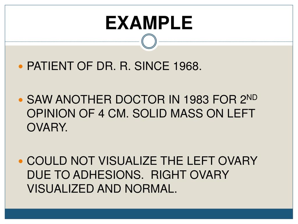 EXAMPLE • PATIENT OF DR. R. SINCE 1968. • SAW ANOTHER DOCTOR IN 1983 FOR 2ND OPINION OF 4 CM. SOLID MASS ON LEFT OVARY. • COULD NOT VISUALIZE THE LEFT OVARY DUE TO ADHESIONS. RIGHT OVARY VISUALIZED AND NORMAL.