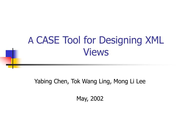 A CASE Tool for Designing XML Views. Yabing Chen, Tok Wang Ling, Mong Li Lee May, 2002. Contents. Introduction Preliminaries Architecture of the CASE tool An illustrating example Related work Conclusion Q & A. Part 1. Introduction. Introduction. XML – eXtensible Markup Language