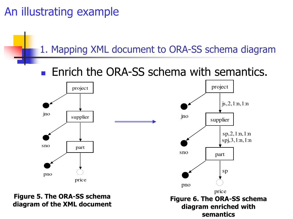 An illustrating example 1. Mapping XML document to ORA-SS schema diagram • Transform an XML document to ORA-SS <db> <project jno=”j001”> <supplier sno=“s001”> <part pno=“p001”> <price> 100</price> </part> </supplier> <supplier sno=“s002”> <part pno=“p001”> <price> 100</price> </part> </supplier> </project> </db> Figure 4. An XML document on project, supplier and part Figure 5. The ORA-SS schema diagram of the XML document