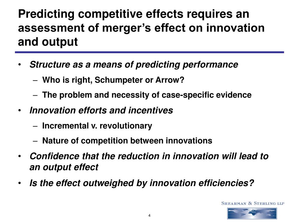 Predicting competitive effects requires an assessment of merger’s effect on innovation and output • Structure as a means of predicting performance • Who is right, Schumpeter or Arrow? • The problem and necessity of case-specific evidence • Innovation efforts and incentives • Incremental v. revolutionary • Nature of competition between innovations • Confidence that the reduction in innovation will lead to an output effect • Is the effect outweighed by innovation efficiencies?