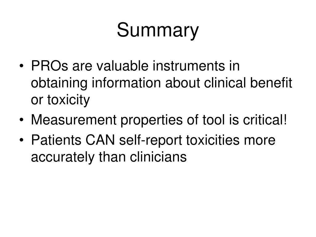 Summary • PROs are valuable instruments in obtaining information about clinical benefit or toxicity • Measurement properties of tool is critical! • Patients CAN self-report toxicities more accurately than clinicians