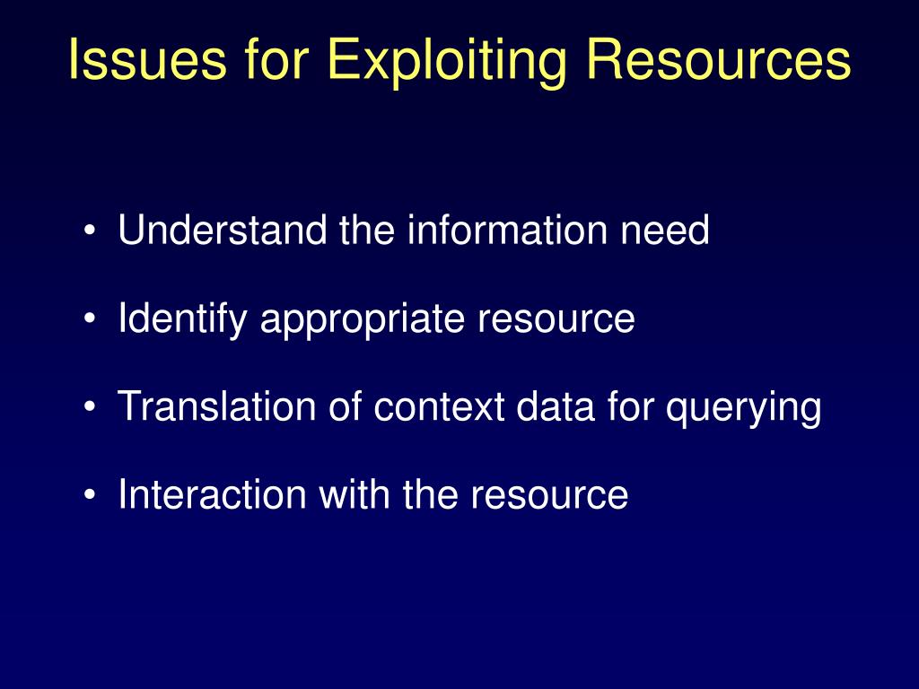 Issues for Exploiting Resources • Understand the information need • Identify appropriate resource • Translation of context data for querying • Interaction with the resource