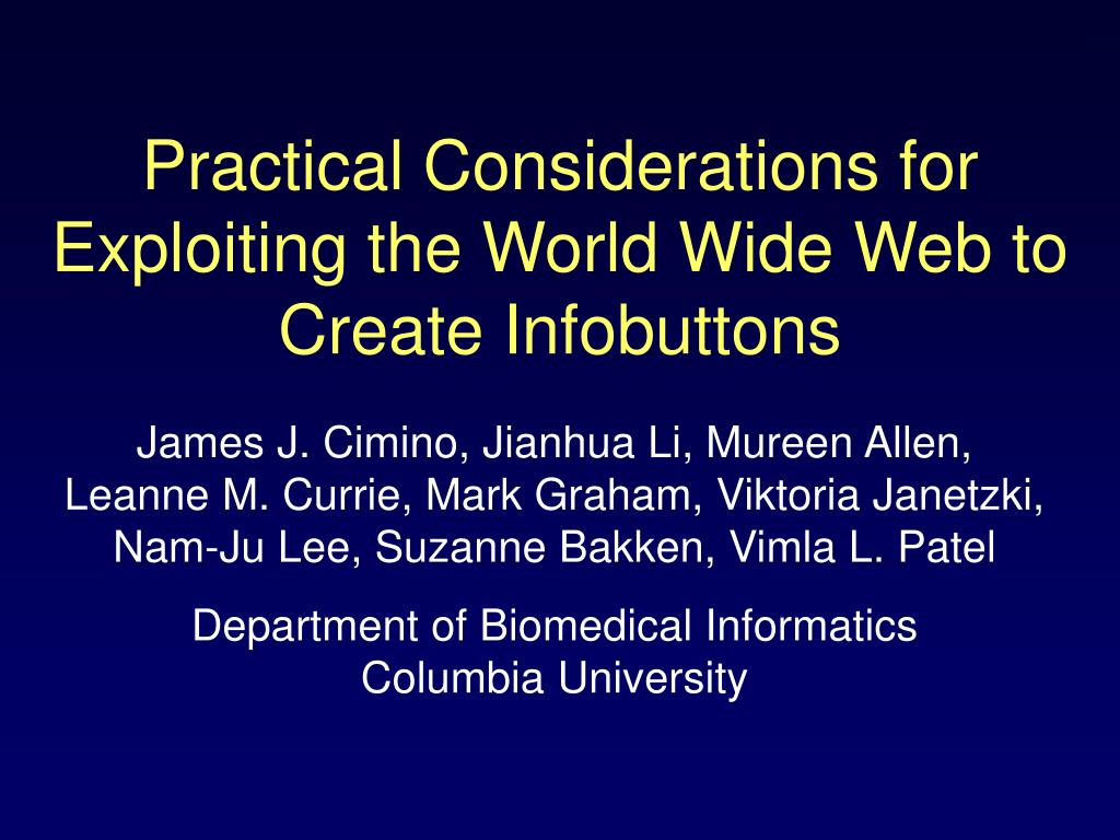 Practical Considerations for Exploiting the World Wide Web to Create Infobuttons. James J. Cimino, Jianhua Li, Mureen Allen, Leanne M. Currie, Mark Graham, Viktoria Janetzki, Nam-Ju Lee, Suzanne Bakken, Vimla L. Patel Department of Biomedical Informatics Columbia University.