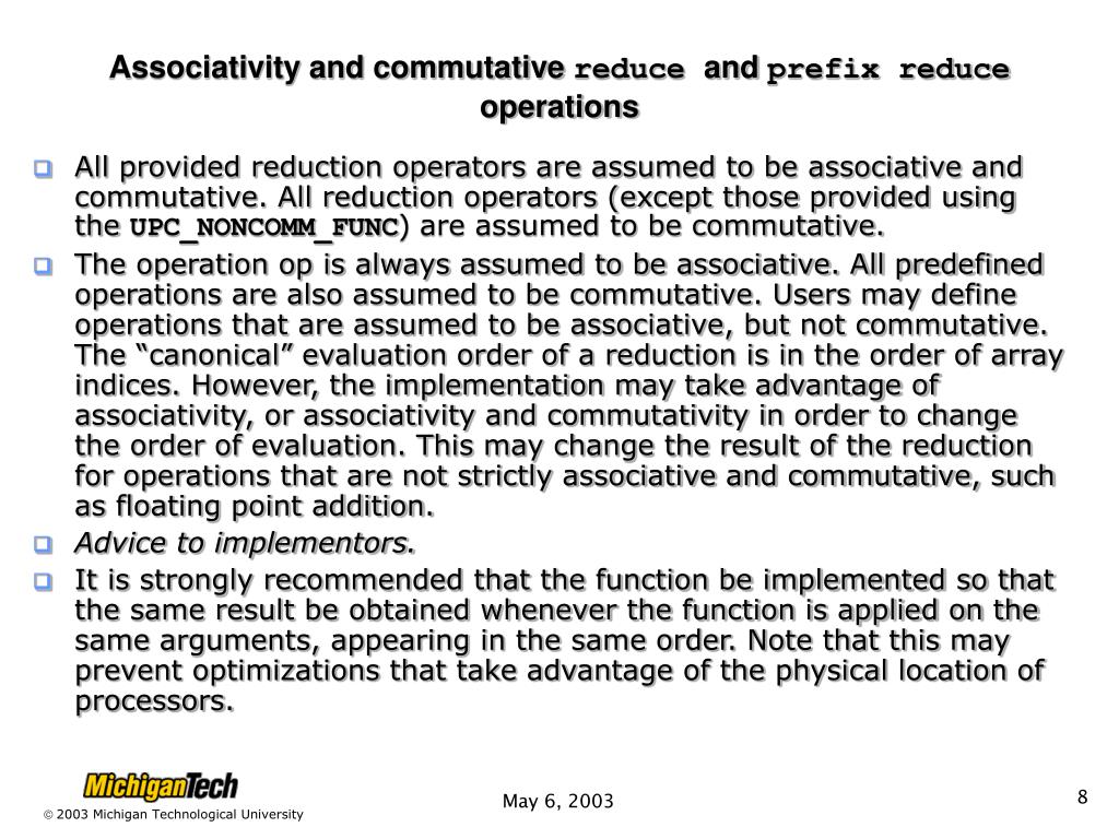Associativity and commutative reduceand prefix reduceoperations • All provided reduction operators are assumed to be associative and commutative. All reduction operators (except those provided using the UPC_NONCOMM_FUNC) are assumed to be commutative. • The operation op is always assumed to be associative. All predefined operations are also assumed to be commutative. Users may define operations that are assumed to be associative, but not commutative. The “canonical” evaluation order of a reduction is in the order of array indices. However, the implementation may take advantage of associativity, or associativity and commutativity in order to change the order of evaluation. This may change the result of the reduction for operations that are not strictly associative and commutative, such as floating point addition. • Advice to implementors. • It is strongly recommended that the function be implemented so that the same result be obtained whenever the function is applied on the same arguments, appearing in the same order. Note that this may prevent optimizations that take advantage of the physical location of processors.