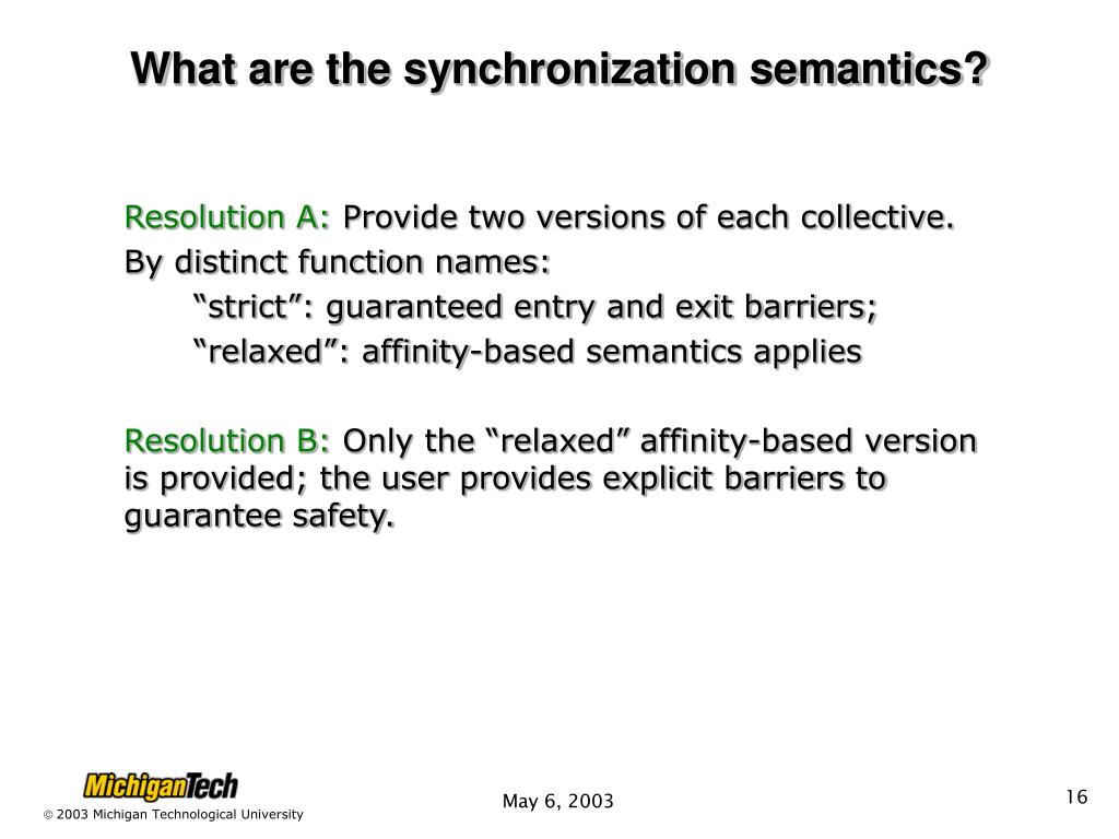 What are the synchronization semantics? Resolution A: Provide two versions of each collective. By distinct function names: “strict”: guaranteed entry and exit barriers; “relaxed”: affinity-based semantics applies Resolution B: Only the “relaxed” affinity-based version is provided; the user provides explicit barriers to guarantee safety.